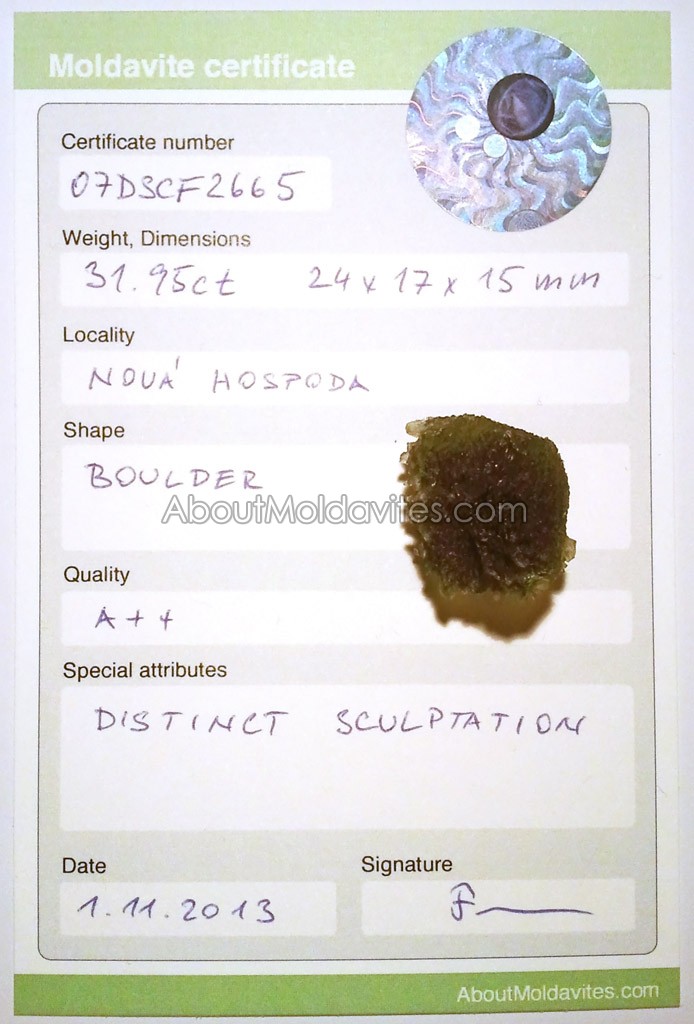07DSCF2665 – moldavite with certificate Frantisek / January 1, 2013 Certificate number: 07DSCF2665 Weight: 31.95ct Dimensions: 24 x 17 x 15mm Locality: Nová Hospoda Shape: Boulder Quality: A++ Special attributes: Distinct sculptation Date: 1.11.2013 FacebookTwitterPinterestTumblrStumbleUponShare this:TweetMoreEmailRedditShare on TumblrPrintLike this:Like Loading...