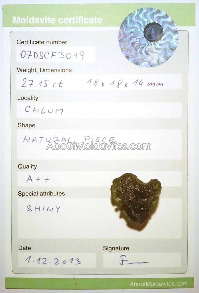 07DSCF3019 – certified moldavite Frantisek / January 18, 2013 Certificate number: 07DSCF3019 Weight: 27.15ct Dimensions: 18 x 18 x 14mm Locality: Chlum Shape: Natural Piece Quality: A++ Special attributes: Shiny Date: 1.12.2013 FacebookTwitterPinterestTumblrStumbleUponShare this:TweetMoreEmailRedditShare on TumblrPrintLike this:Like Loading...