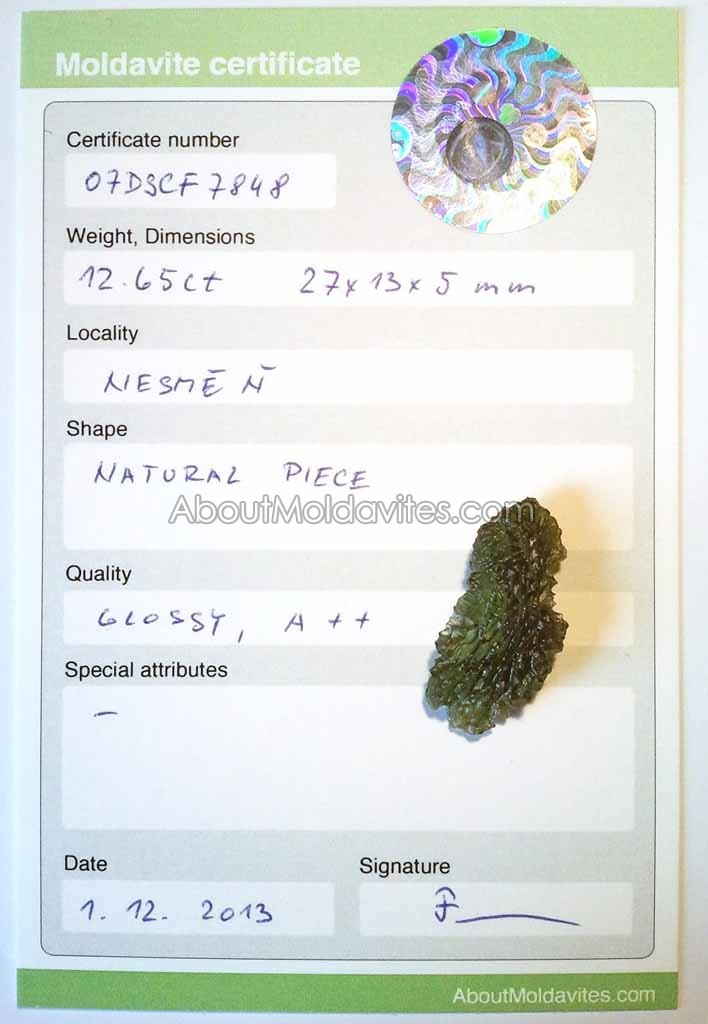 07DSCF7848 – certified moldavite Frantisek / February 5, 2013 Certificate number: 07DSCF7848 Weight: 12.65ct Dimensions: 27 x 13 x 5mm Locality: Nesměň Shape: Natural piece Quality: A++ Special attributes: Glossy Date: 1.12.2013 FacebookTwitterPinterestTumblrStumbleUponShare this:TweetMoreEmailRedditShare on TumblrPrintLike this:Like Loading...