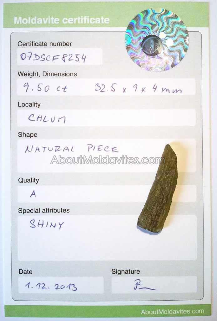 07DSCF8254 – certified moldavite Frantisek / February 5, 2013 Certificate number: 07DSCF8254 Weight: 9.50ct Dimensions: 30.5 x 9 x 4mm Locality: Chlum Shape: Natural piece Quality: A Special attributes: Shiny Date: 1.12.2013 FacebookTwitterPinterestTumblrStumbleUponShare this:TweetMoreEmailRedditShare on TumblrPrintLike this:Like Loading...