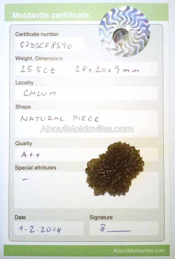 07DSCF8590 – certified moldavite Frantisek / February 6, 2013 Certificate number: 07DSCF8590 Weight: 25.50ct Dimensions: 28 x 20 x 9mm Locality: Chlum Shape: Natural piece Quality: A++ Special attributes: – Date: 1.2.2014 FacebookTwitterPinterestTumblrStumbleUponShare this:TweetMoreEmailRedditShare on TumblrPrintLike this:Like Loading...