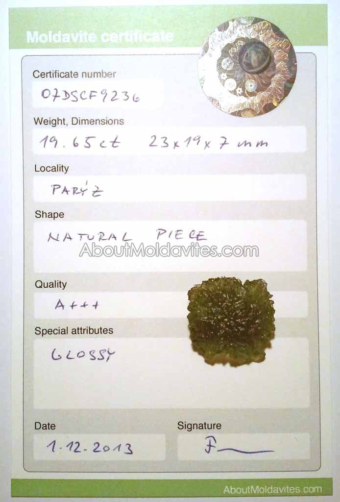 07DSCF9236 – certified moldavite Frantisek / January 7, 2013 Certificate number: 07DSCF9236 Weight: 19.65ct Dimensions: 23 x 19 x 7mm Locality: Parýz Shape: Natural piece Quality: A+++ Special attributes: Glossy Date: 1.12.2013 FacebookTwitterPinterestTumblrStumbleUponShare this:TweetMoreEmailRedditShare on TumblrPrintLike this:Like Loading...
