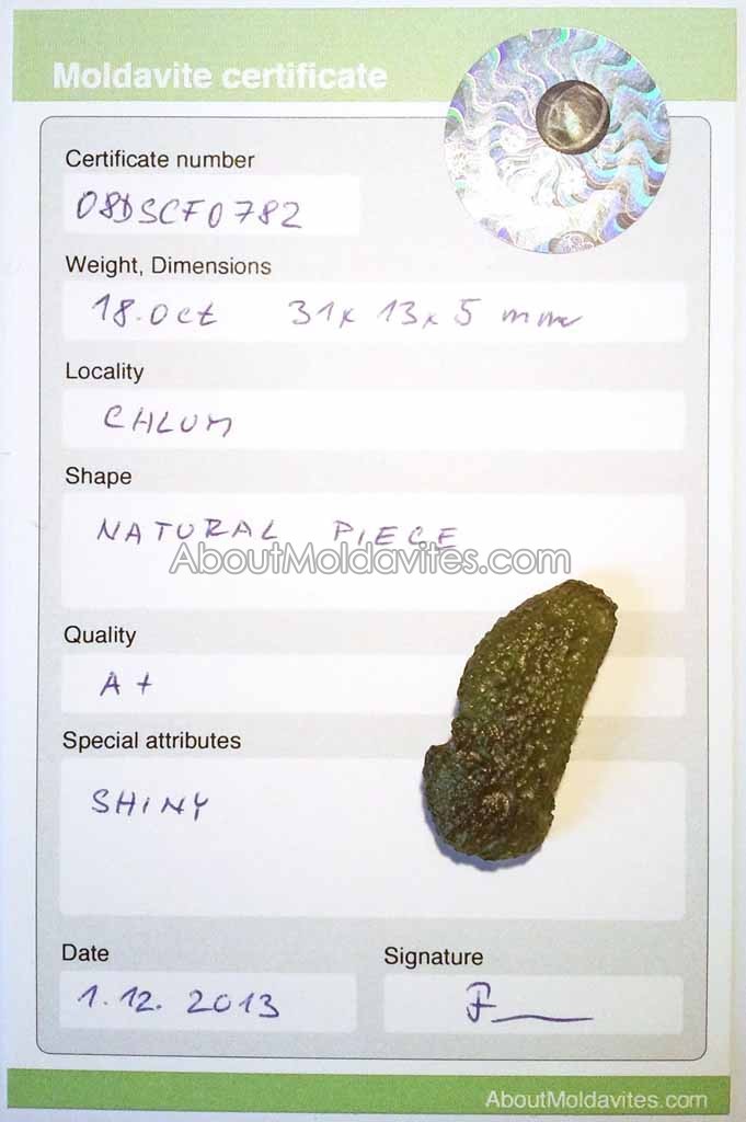 08DSCF0782 – certified moldavite Frantisek / January 18, 2013 Certificate number: 08DSCF0782 Weight: 18.00ct Dimensions: 31 x 13 x 5mm Locality: Chlum Shape: Natural piece Quality: A+ Special attributes: Shiny Date: 1.12.2013 FacebookTwitterPinterestTumblrStumbleUponShare this:TweetMoreEmailRedditShare on TumblrPrintLike this:Like Loading...