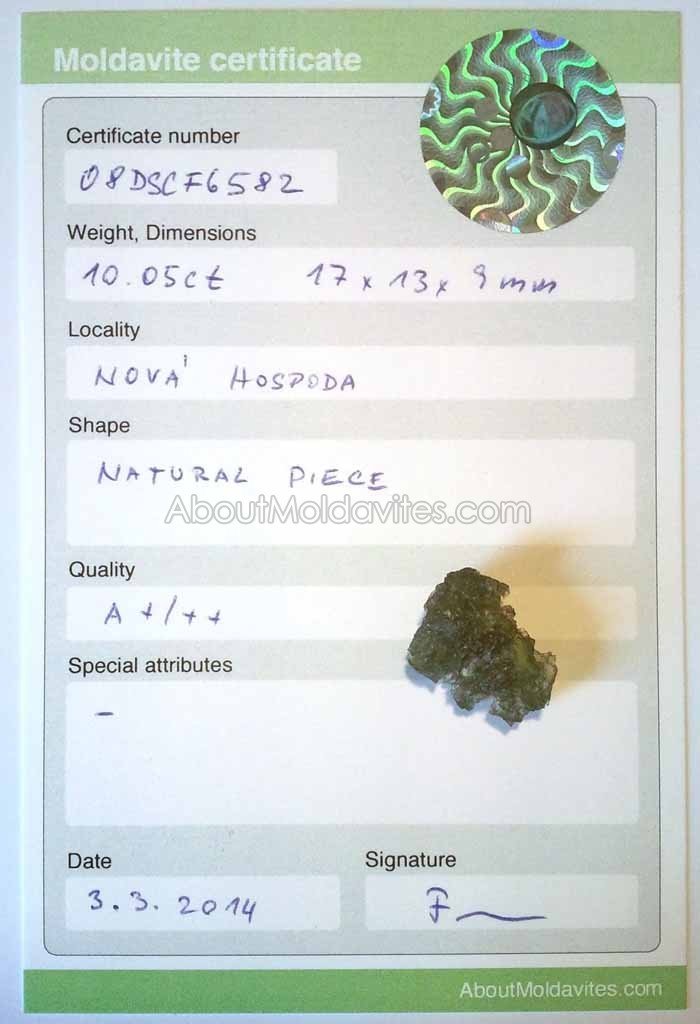 08DSCF6582 – certified moldavite Frantisek / January 18, 2013 Certificate number: 08DSCF6582 Weight: 10.05ct Dimensions: 17 x 13 x 9mm Locality: Nová Hospoda Shape: Natural piece Quality: A+/++ Special attributes: – Date: 3.3.2014 FacebookTwitterPinterestTumblrStumbleUponShare this:TweetMoreEmailRedditShare on TumblrPrintLike this:Like Loading...