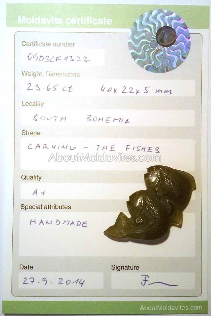 09DSCF1322 – certified moldavite Frantisek / January 15, 2013 Certificate number: 09DSCF1322 Weight: 23.65ct Dimensions: 40 x 22 x 5mm Locality: South Bohemia Shape: Carving – the fishes Quality: A+ Special attributes: Handmade Date: 27.9.2014 FacebookTwitterPinterestTumblrStumbleUponShare this:TweetMoreEmailRedditShare on TumblrPrintLike this:Like Loading...
