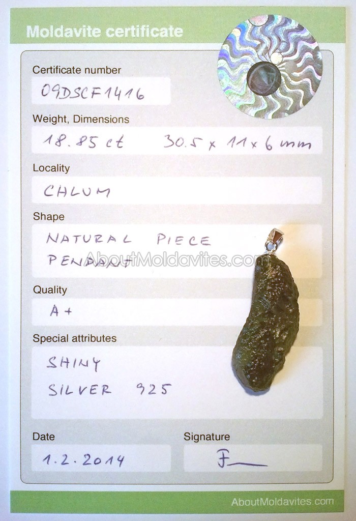 09DSCF1416 – certified moldavite Frantisek / January 8, 2013 Certificate number: 09DSCF1416 Weight: 18.85ct Dimensions: 30.5 x 11 x 6mm Locality: Chlum Shape: Natural piece – pendant Quality: A+ Special attributes: Shiny moldavite, Silver 925 Date: 1.2.2014 FacebookTwitterPinterestTumblrStumbleUponShare this:TweetMoreEmailRedditShare on TumblrPrintLike this:Like Loading...