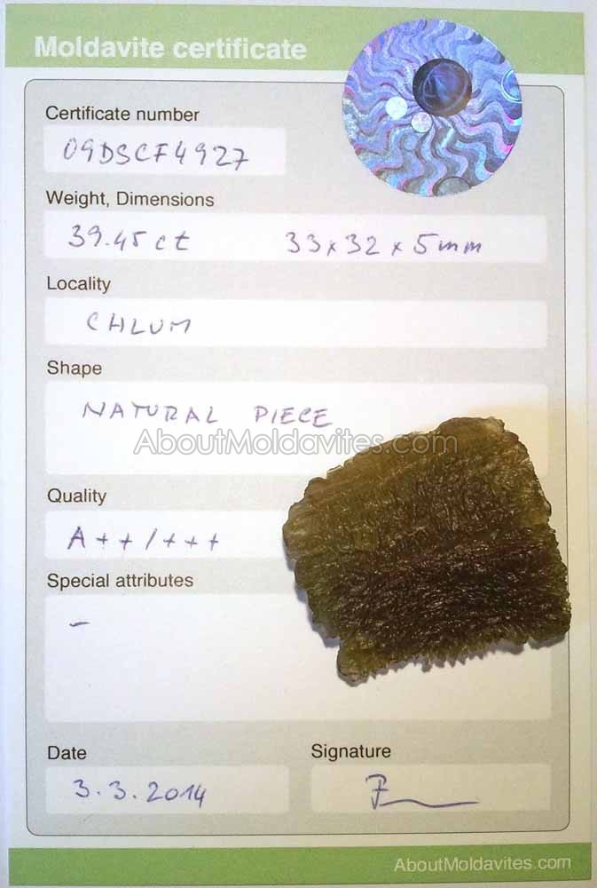 09DSCF4927 – Certificate Frantisek / January 4, 2013 Certificate number: 09DSCF4927 Weight: 39.45ct Dimensions: 33 x 32 x 5mm Locality: Chlum Shape: Natural piece Quality: A++/+++ Special attributes: – Date: 3.3.2014 FacebookTwitterPinterestTumblrStumbleUponShare this:TweetMoreEmailRedditShare on TumblrPrintLike this:Like Loading...