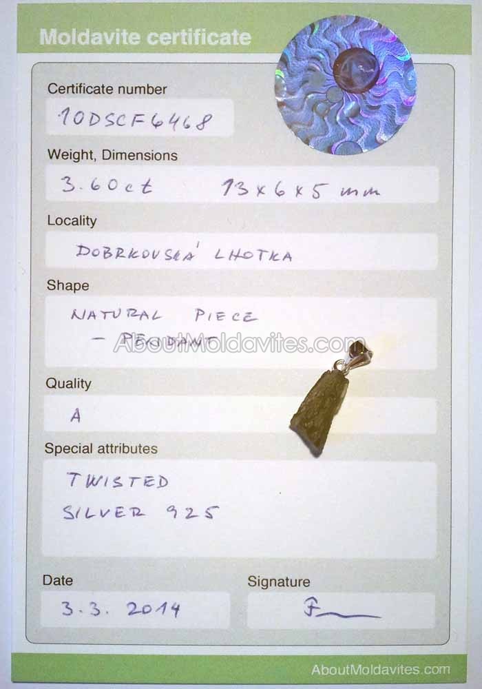 10DSCF6468 – Certificate Frantisek / January 4, 2013 Certificate number: 10DSCF6468 Weight: 3.60ct Dimensions: 13 x 6 x 5mm Locality: Dobrkovská Lhotka Shape: Natural piece – Pendant Quality: A Special attributes: Twisted, Silver 925 Date: 3.3.2014 FacebookTwitterPinterestTumblrStumbleUponShare this:TweetMoreEmailRedditShare on TumblrPrintLike this:Like Loading...