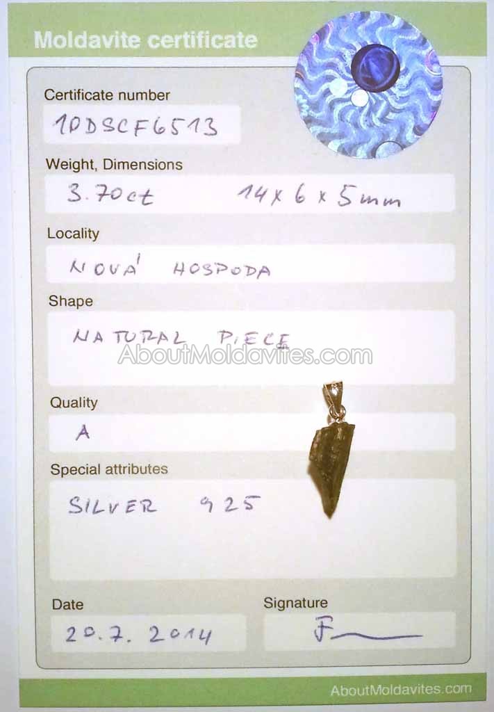 10DSCF6513 – certified moldavite Frantisek / January 7, 2013 Certificate number: 10DSCF6513 Weight: 3.70ct Dimensions: 14 x 6 x 5mm Locality: Nová Hospoda Shape: Natural piece – pendant Quality: A Special attributes: Silver 925 Date: 20.7.2014 FacebookTwitterPinterestTumblrStumbleUponShare this:TweetMoreEmailRedditShare on TumblrPrintLike this:Like Loading...