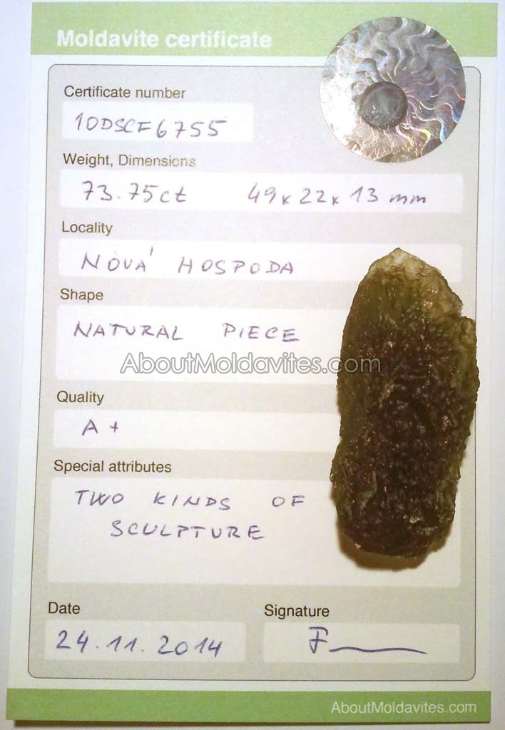 10DSCF6755 – Certificate Frantisek / January 9, 2013 Certificate number: 10DSCF6755 Weight: 73.75ct Dimensions: 49 x 27 x 13mm Locality: Nová Hospoda Shape: Natural piece Quality: A+ Special attributes: Two kinds of sculpture Date: 24.11.2014 FacebookTwitterPinterestTumblrStumbleUponShare this:TweetMoreEmailRedditShare on TumblrPrintLike this:Like Loading...