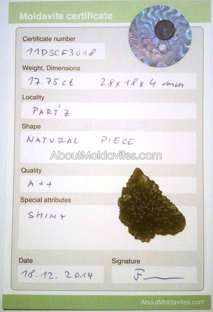 11DSCF3018 – certified moldavite Frantisek / January 3, 2013 Certificate number: 11DSCF3018 Weight: 17.75ct Dimensions: 28 x 18 x 4mm Locality: Parýz Shape: Natural piece Quality: A++ Special attributes: Shiny Date: 18.12.2014 FacebookTwitterPinterestTumblrStumbleUponShare this:TweetMoreEmailRedditShare on TumblrPrintLike this:Like Loading...