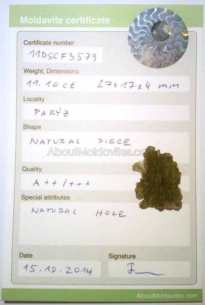 11DSCF3579 – certified moldavite Frantisek / January 15, 2013 Certificate number: 11DSCF3579 Weight: 11.10ct Dimensions: 27 x 17 x 4mm Locality: Parýz Shape: Natural piece Quality: A++/+++ Special attributes: Natural hole Date: 15.10.2014 FacebookTwitterPinterestTumblrStumbleUponShare this:TweetMoreEmailRedditShare on TumblrPrintLike this:Like Loading...