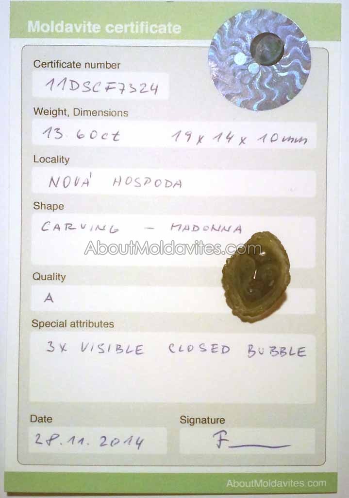 11DSCF7324 – certified moldavite Frantisek / January 4, 2013 Certificate number: 11DSCF7324 Weight: 13.60ct Dimensions: 19 x 14 x 10mm Locality: Nová Hospoda Shape: Carving – Madonna Quality: A Special attributes: Handmade. With visible clossed bubbles Date: 28.11.2014 FacebookTwitterPinterestTumblrStumbleUponShare this:TweetMoreEmailRedditShare on TumblrPrintLike this:Like Loading...
