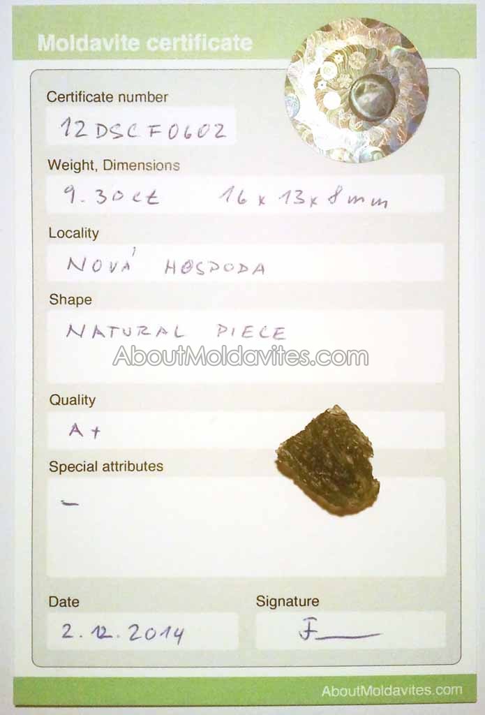 12DSCF0602 – certified moldavite Frantisek / January 16, 2013 Certificate number: 12DSCF0602 Weight: 9.30ct Dimensions: 16 x 13 x 8mm Locality: Nová Hospoda Shape: Natural piece Quality: A+ Special attributes: – Date: 2.12.2014 FacebookTwitterPinterestTumblrStumbleUponShare this:TweetMoreEmailRedditShare on TumblrPrintLike this:Like Loading...