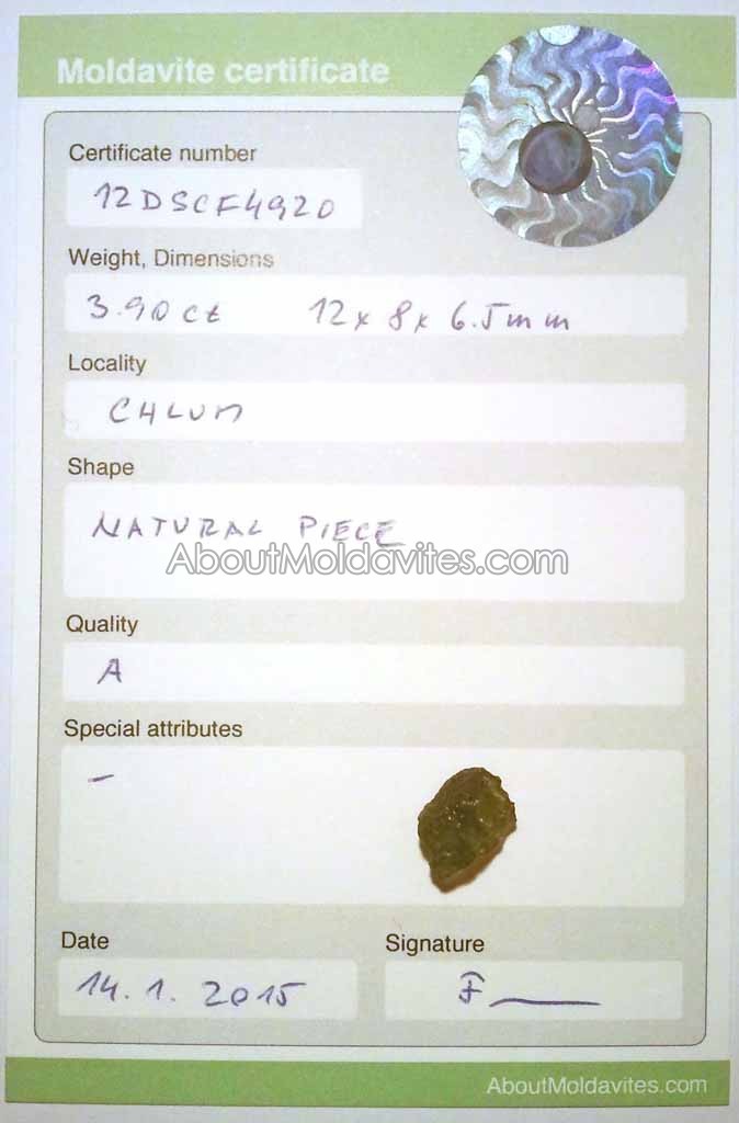 12DSCF4920 – certified moldavite Frantisek / January 16, 2013 Certificate number: 12DSCF4920 Weight: 3.90ct Dimensions: 12 x 8 x 6.5mm Locality: Chlum Shape: Natural piece Quality: A Special attributes: – Date: 14.1.2015 FacebookTwitterPinterestTumblrStumbleUponShare this:TweetMoreEmailRedditShare on TumblrPrintLike this:Like Loading...