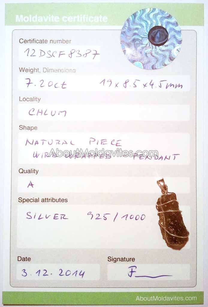 12DSCF8387 – certified moldavite Frantisek / January 4, 2013 Certificate number: 12DSCF8387 Weight: 7.20ct Dimensions: 19 x 8.5 x 4.5mm Locality: Chlum Shape: Natural piece – wire wrapped – pendant Quality: A Special attributes: Silver 925/1000 Date: 3.2.2014 FacebookTwitterPinterestTumblrStumbleUponShare this:TweetMoreEmailRedditShare on TumblrPrintLike this:Like Loading...