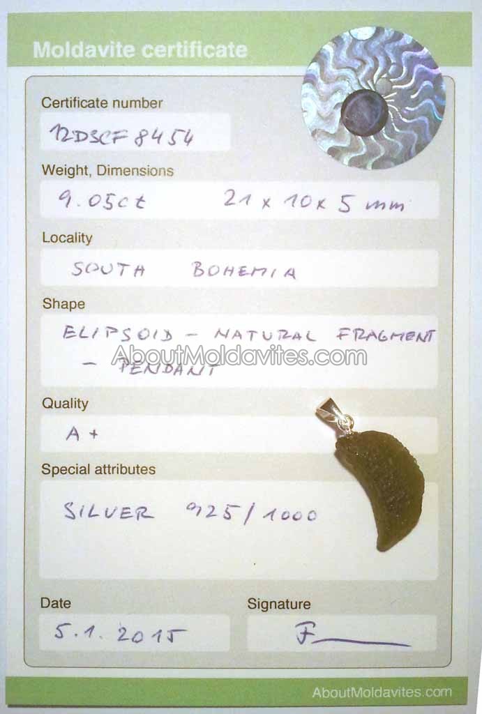 12DSCF8454 – Certificate Frantisek / January 2, 2013 Certificate number: 12DSCF8454(8) Weight: 9.05ct Dimensions: 21 x 10 x 5 mm Locality: South Bohemia Shape: Elispoid – natural fragment – pendant Quality: A+ Special attributes: Silver 925/1000 Date: 5. 1. 2015 FacebookTwitterPinterestTumblrStumbleUponShare this:TweetMoreEmailRedditShare on TumblrPrintLike this:Like Loading...