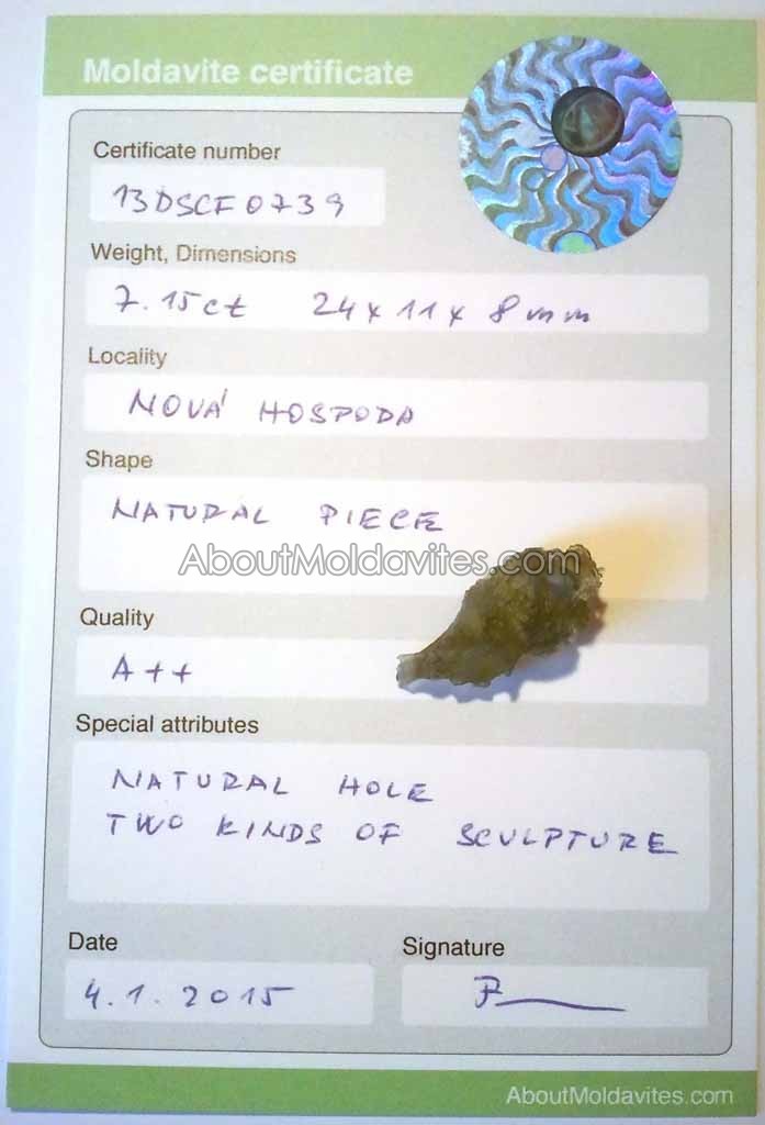 13DSCF0739 – certified moldavite Frantisek / January 4, 2013 Certificate number: 13DSCF0739 Weight: 7.15ct Dimensions: 24 x 11 x 8mm Locality: Nová Hospoda Shape: Natural piece Quality: A++ Special attributes: Natural hole, two kinds of sculpture Date: 1.12.2013 FacebookTwitterPinterestTumblrStumbleUponShare this:TweetMoreEmailRedditShare on TumblrPrintLike this:Like Loading...