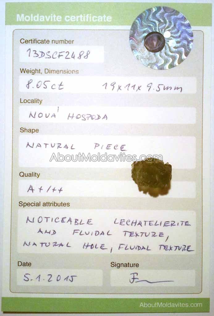 Special attributes: – Color: Bottle green, natural Hole, Rare moldavite, two kinds of sculptation, noticeable lechatelierite, noticeable fluidal texture,