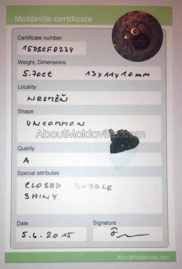 15DSCF0234 – Certificate Frantisek / January 21, 2013 Certificate number: 15DSCF0234 Weight: 5.7ct Dimensions: 13 x 11 x 10 mm Locality: Nesmen Shape: Uncommon Quality: A Special attributes: Shiny, Color: Bottle green, closed bubble, Date: 5. 6. 2015 FacebookTwitterPinterestTumblrStumbleUponShare this:TweetMoreEmailRedditShare on TumblrPrintLike this:Like Loading...